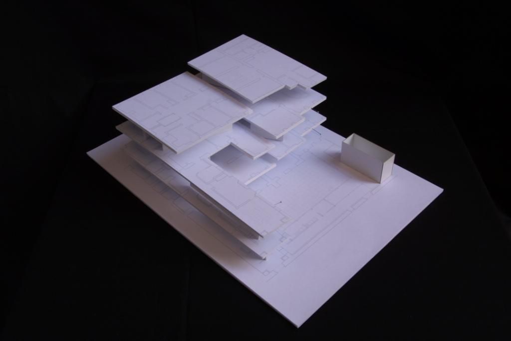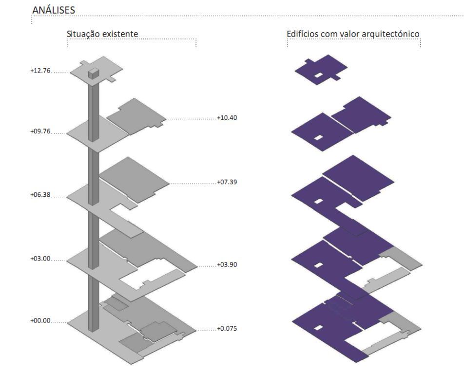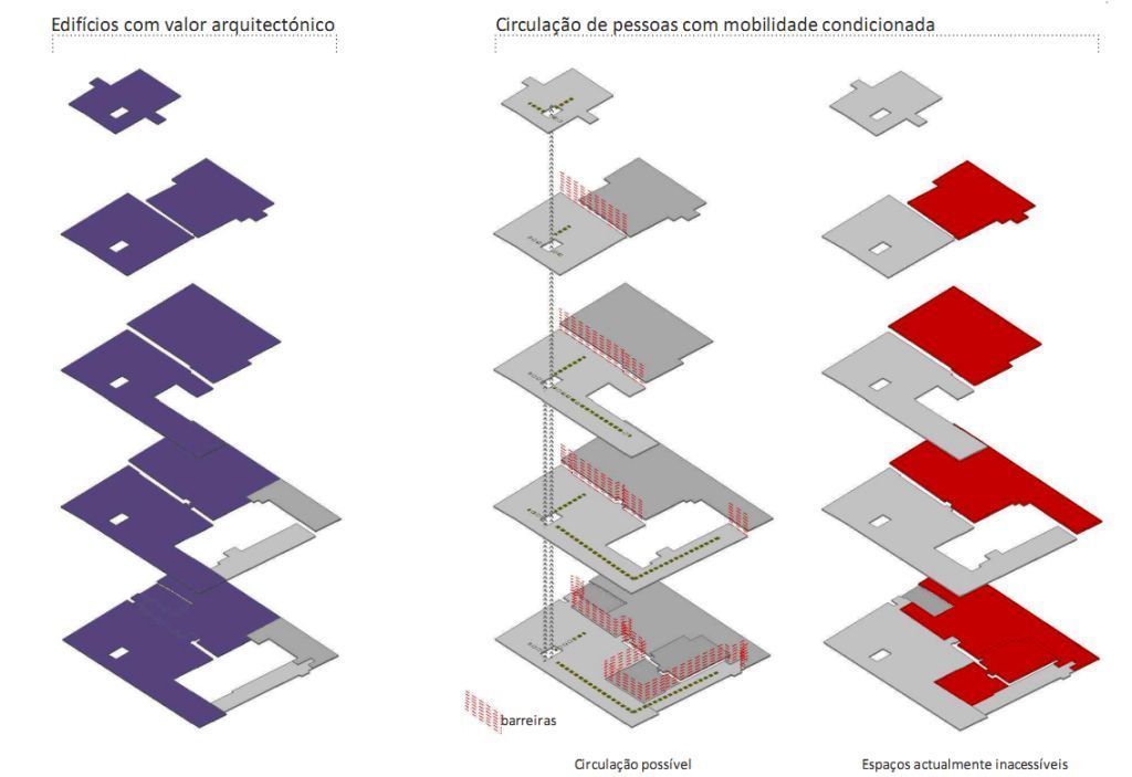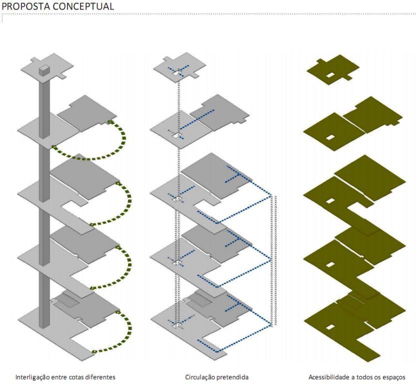Em síntese: em alternativa a uma solução formal fechada, pretende-se a definição de um sistema composto por um núcleo de caixa de escadas e ascensor, complementado com rampas que permitam as acessibilidades necessárias, num conjunto enquadrado pelas preexistências.
