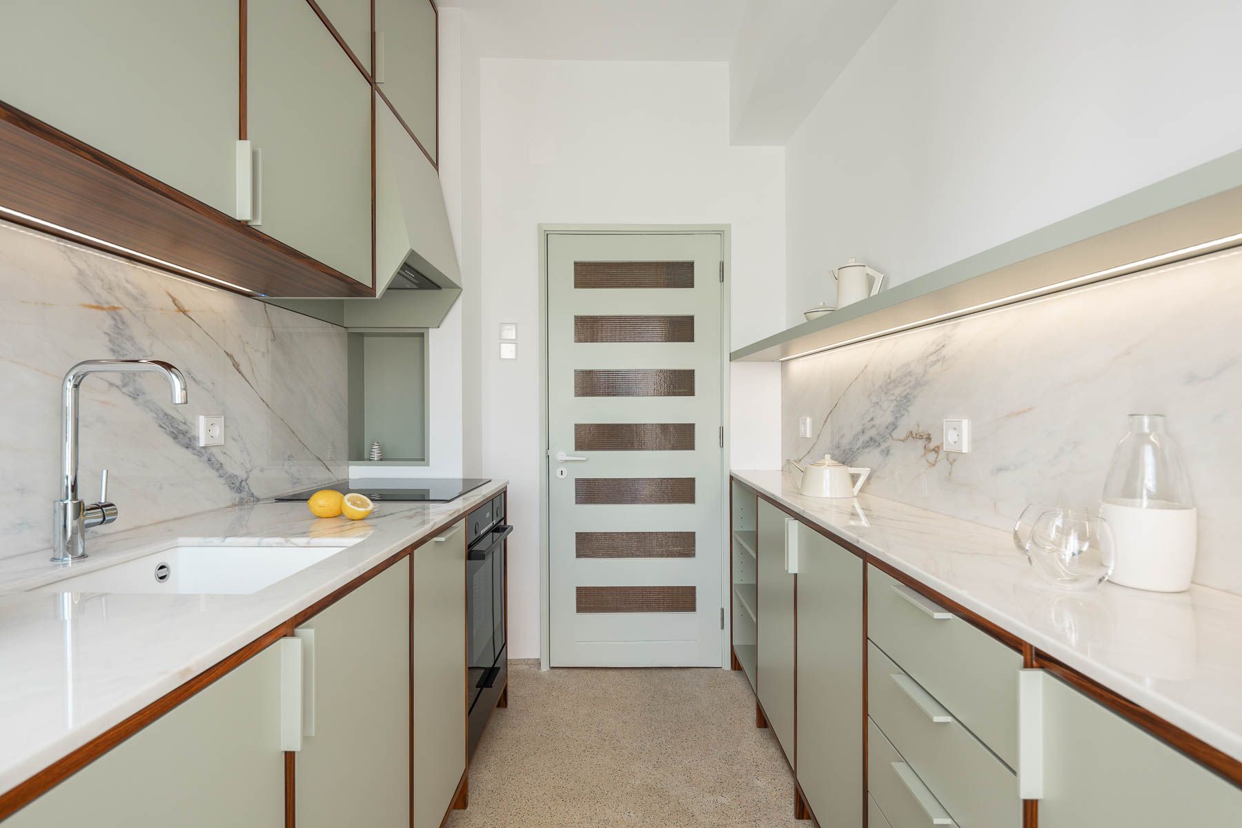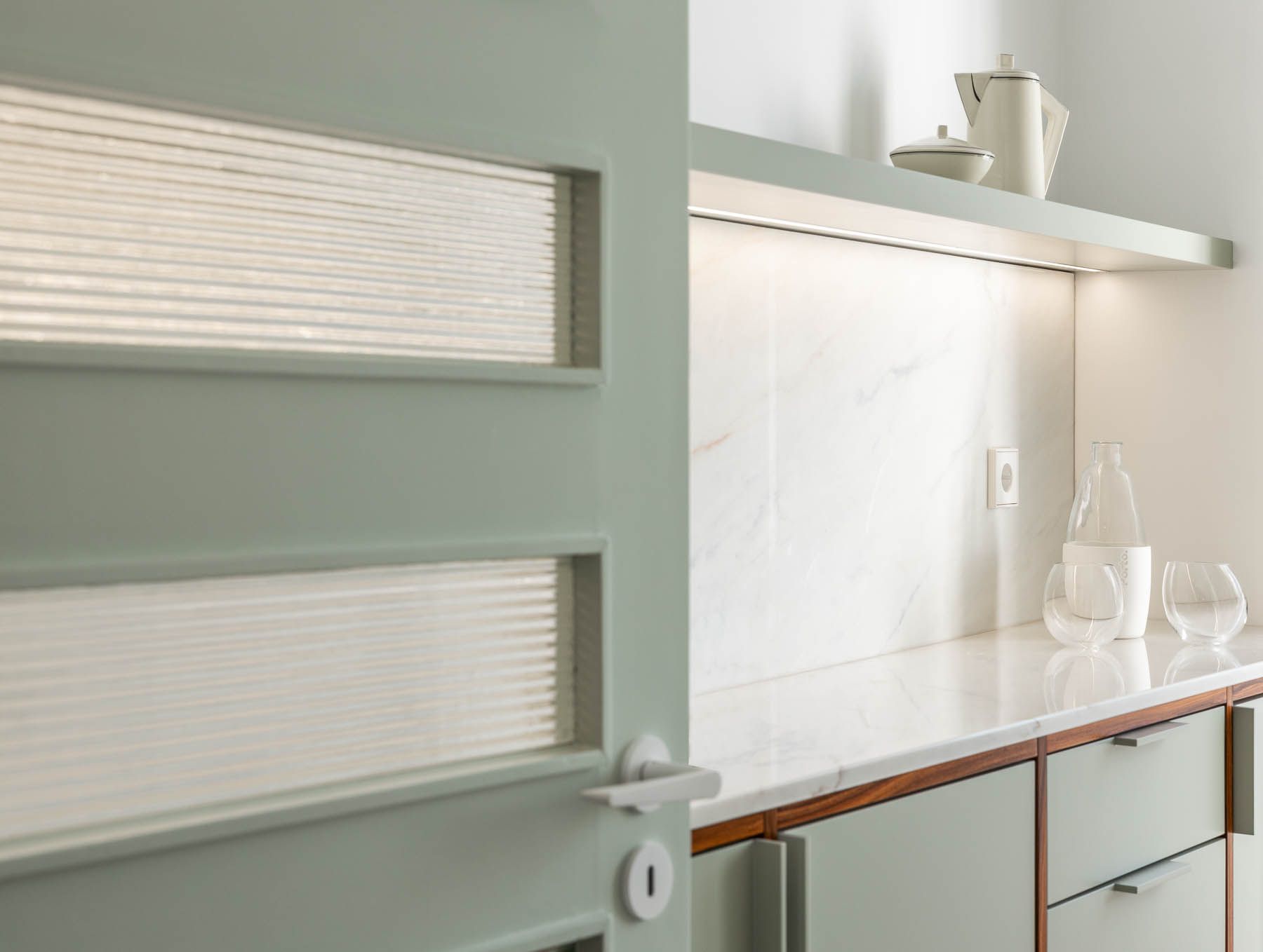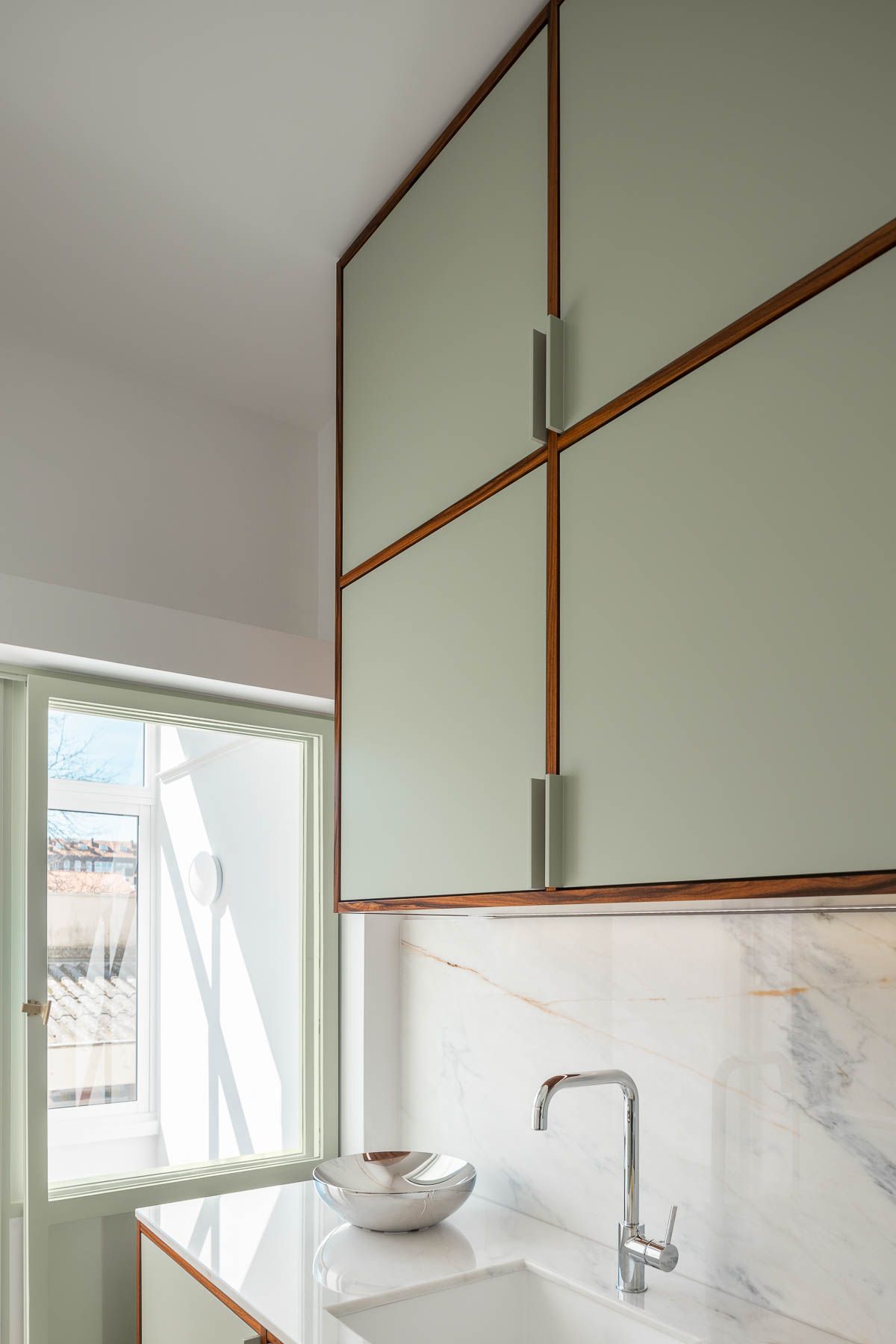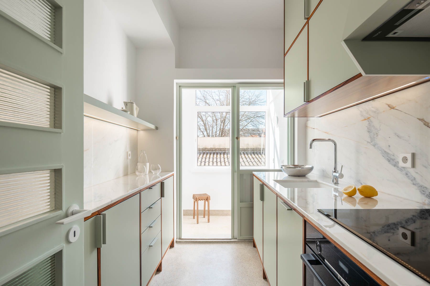 The refurbishment focused on these spaces, with special attention to preserving the original wooden elements. The kitchen was rethought according to current requirements, concentrating equipment on one side, inspired by the intervention made in another modernist apartment on Avenida Fernão de Magalhães.