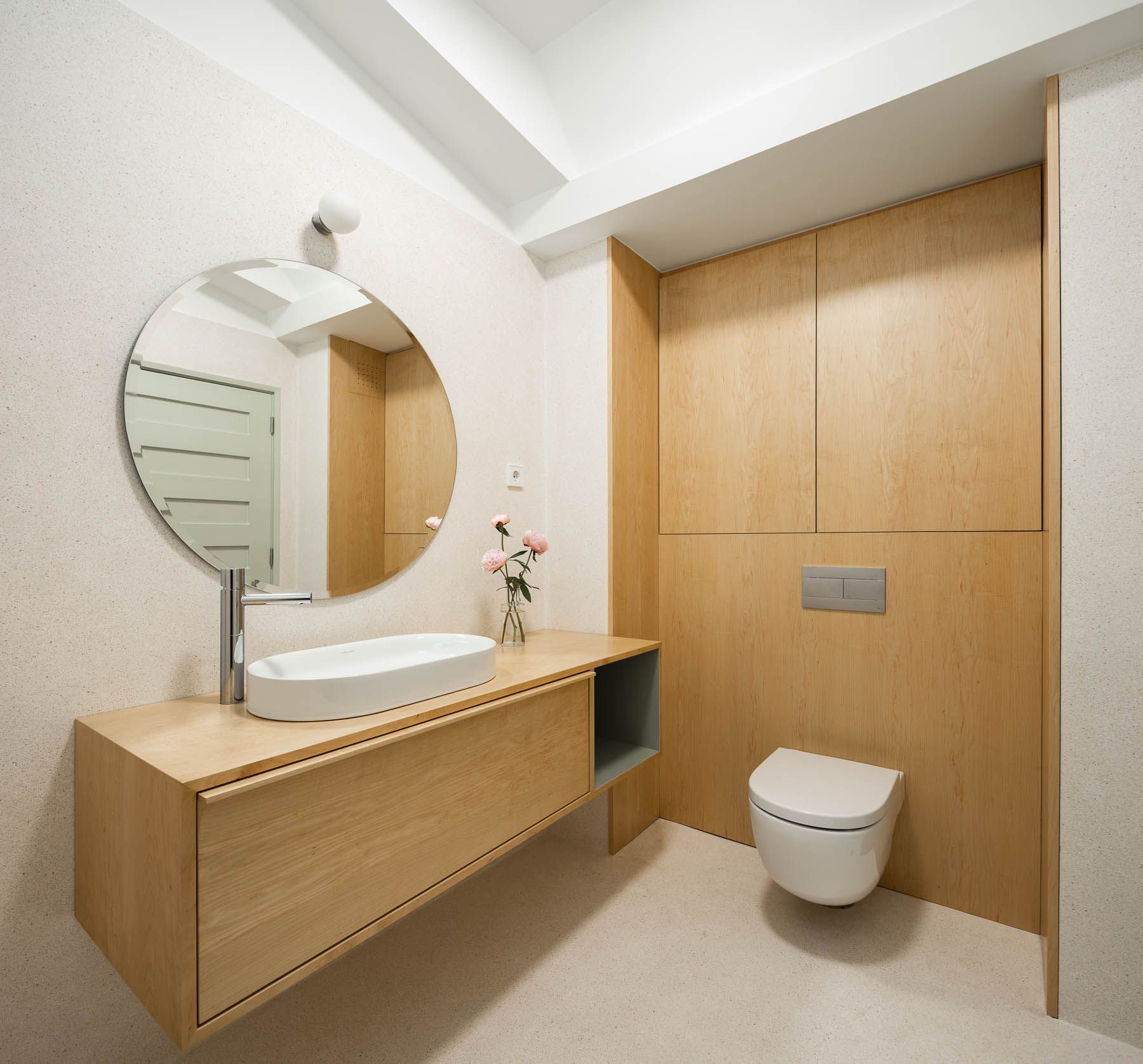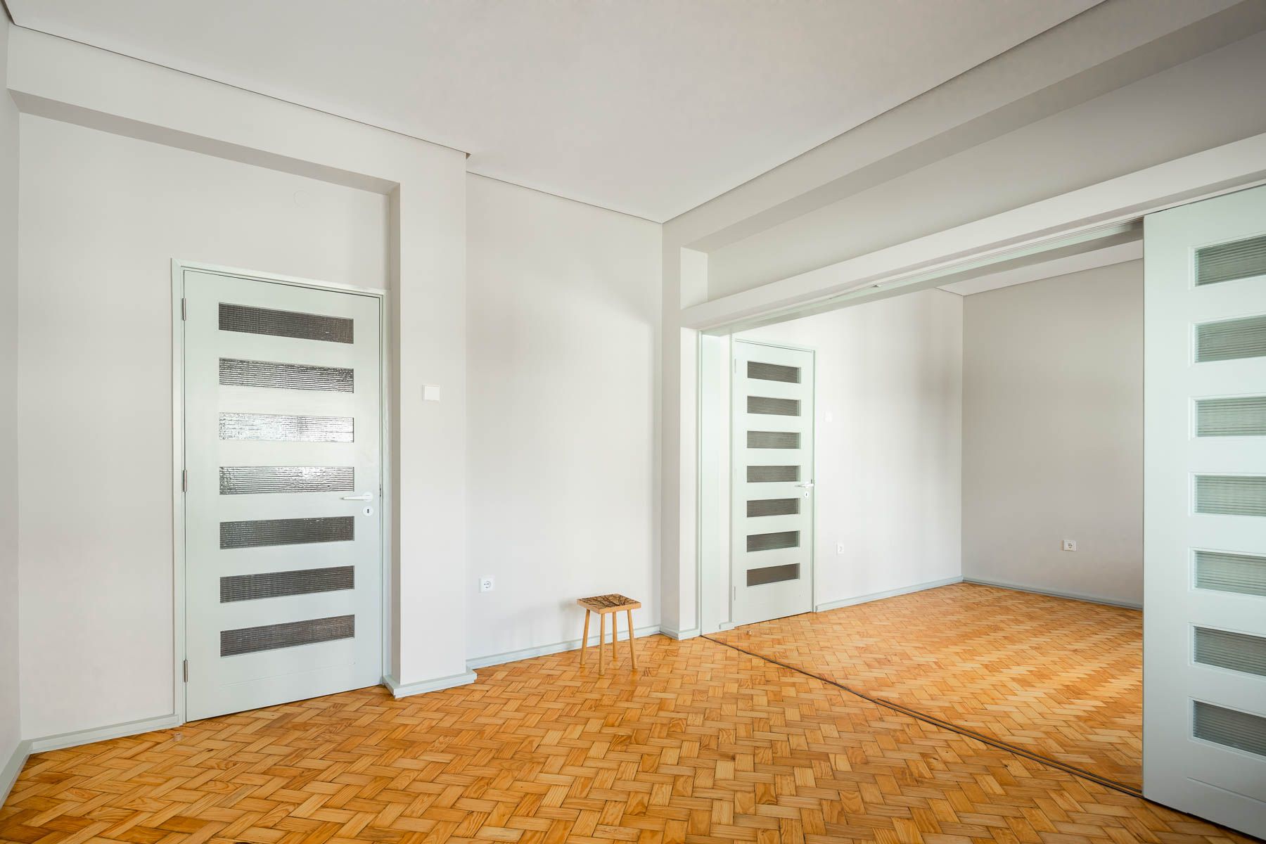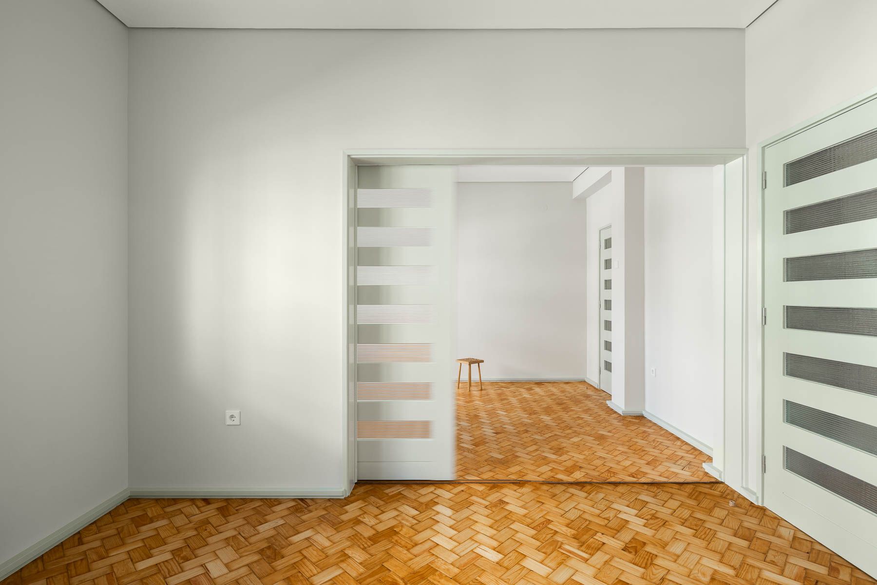 With around 70 m², the apartment stands out for its spatial flexibility, allowing the living room to be divided to create a bedroom or office. Despite being in generally good condition - with original pine parquet flooring, doors, fittings and skirting boards - the kitchen and bathroom, which had been the target of unfortunate interventions, required a complete renovation.