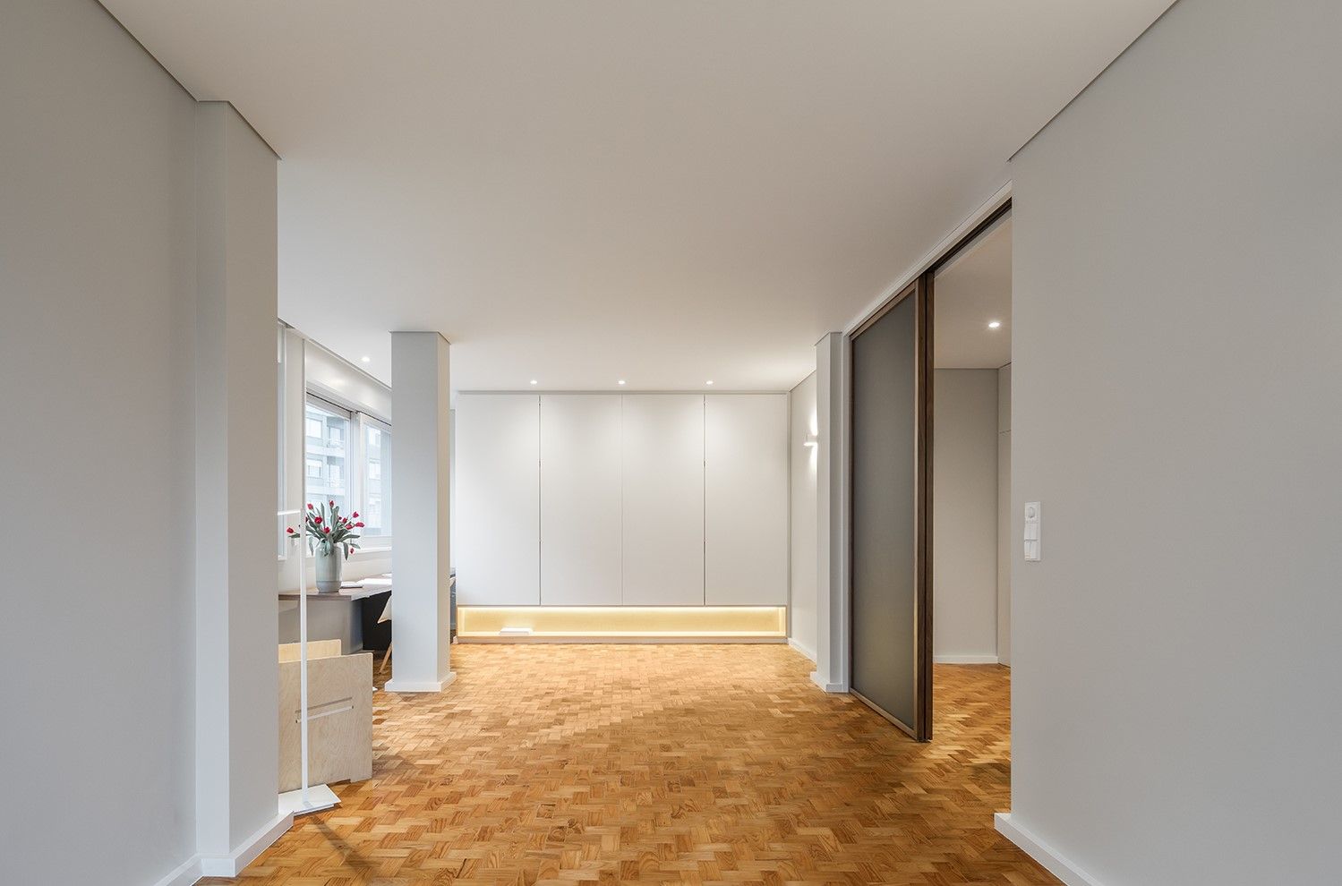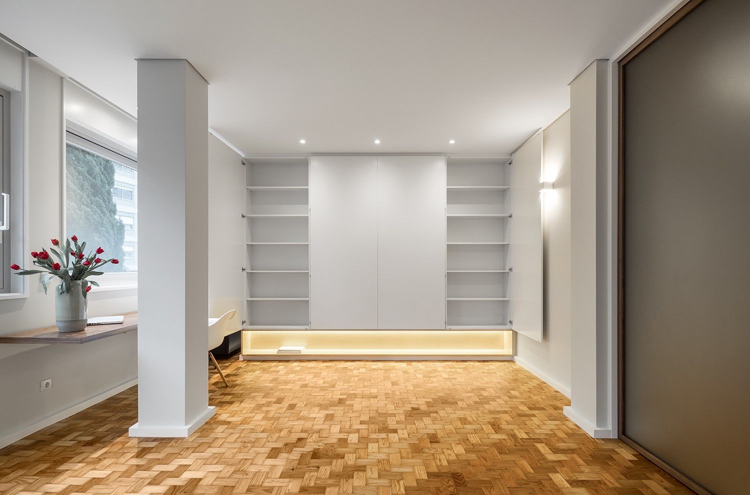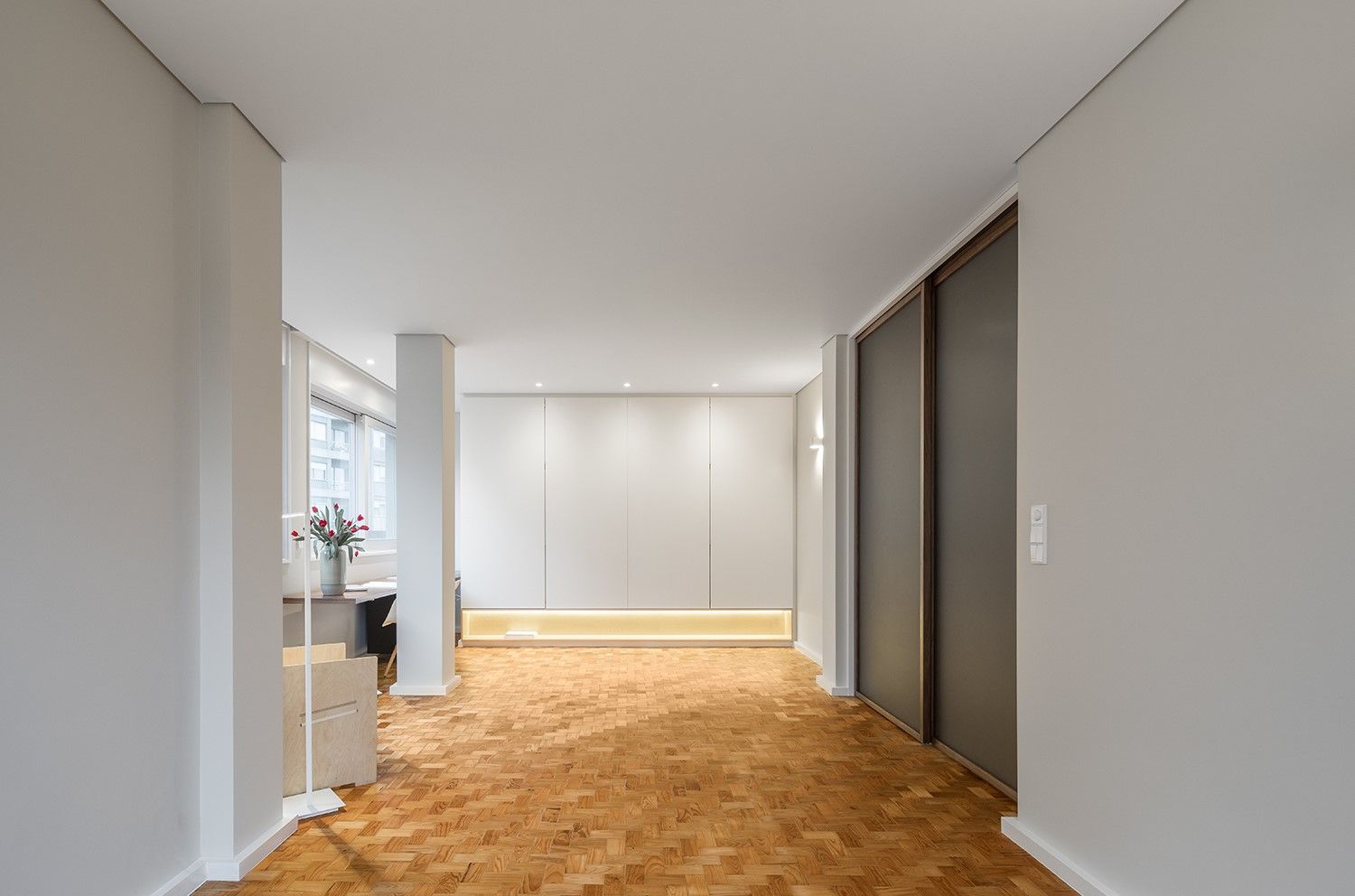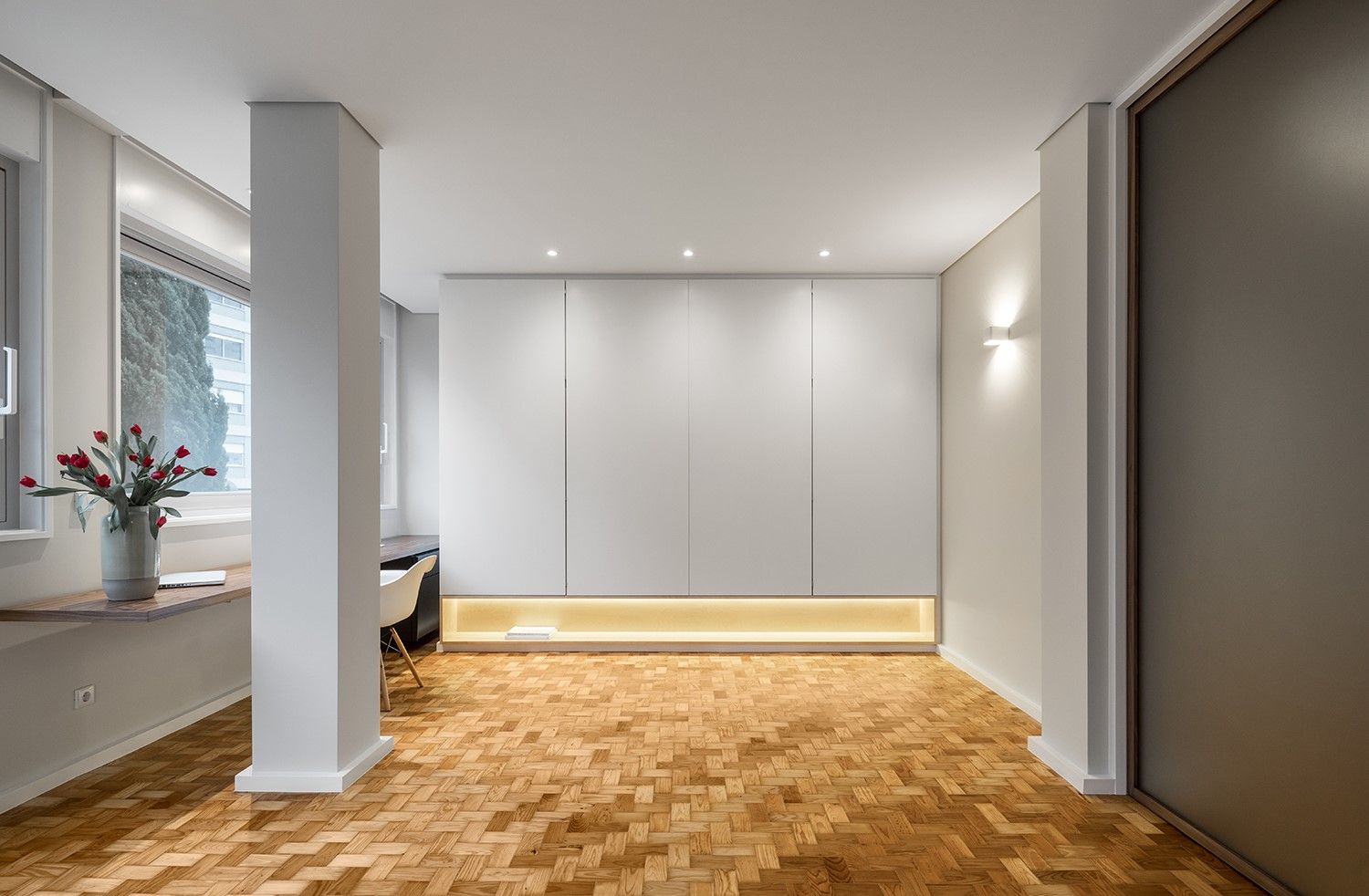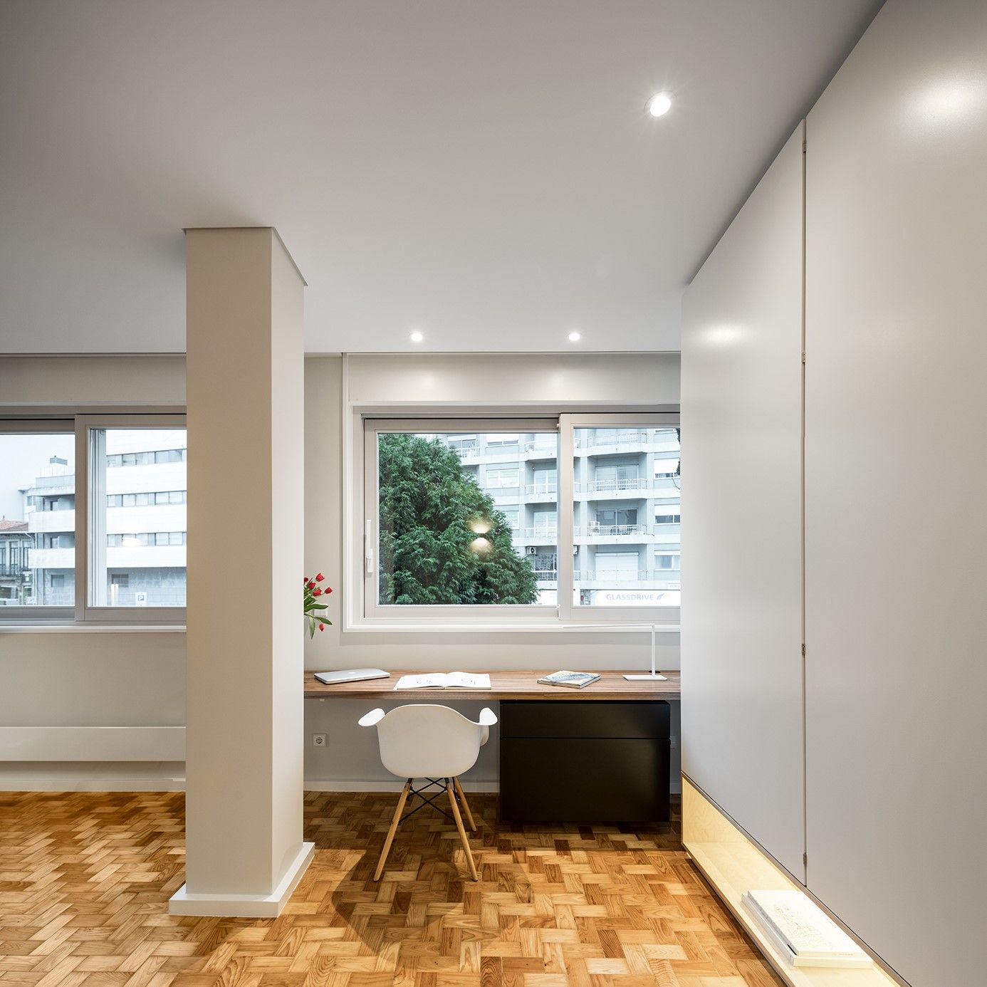 As opções de acabamento das madeiras – pintura das existentes e envernizamento das novas superfícies – tornaram possível uma separação clara dos novos elementos desenhados nesta intervenção: destacam-se uma mesa de trabalho fixa junto à janela da sala e uma porta de correr em vidro translúcido cinza, com aro em madeira de nogueira, que permite diferentes leituras desde a entrada.