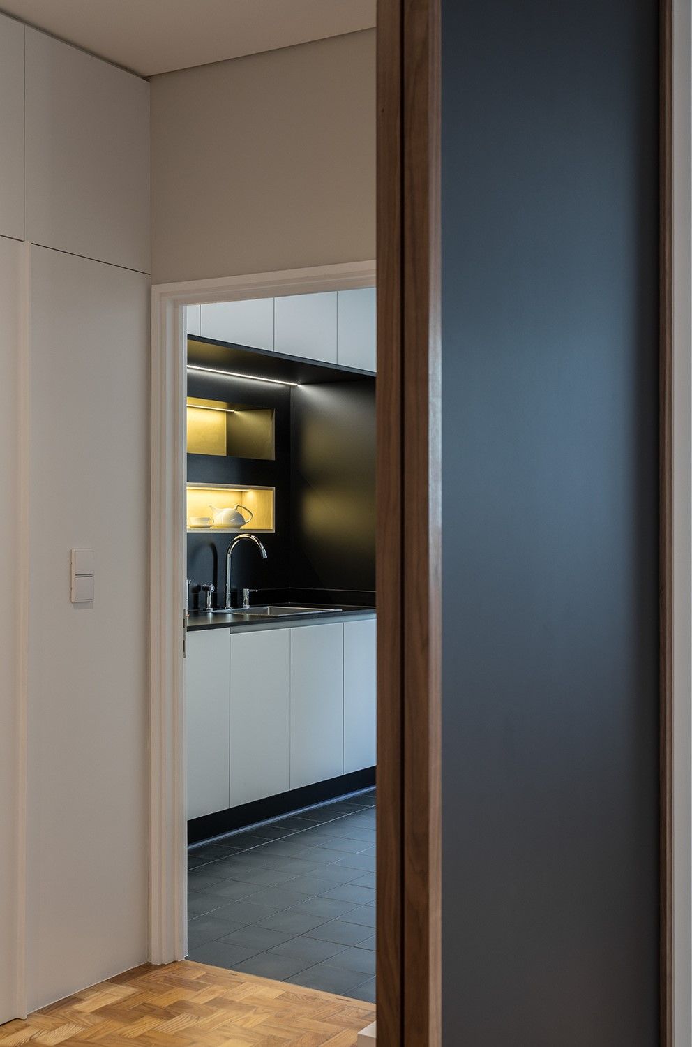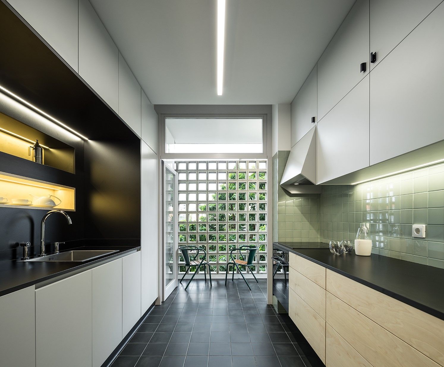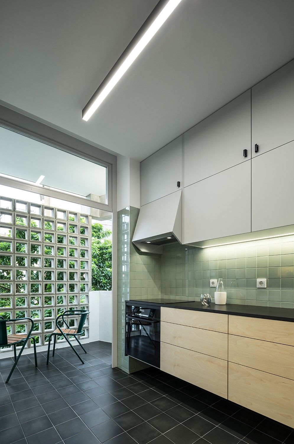Na cozinha, aplicaram-se s revestimentos com características próximas dos originais: azulejo verde-água nas paredes (11x11 cm) e ladrilho cinza no pavimento (20x20 cm). O armário superior existente foi replicado com adaptações ergonómicas. Foi criada uma bancada com armários e reorganizado o acesso à varanda.