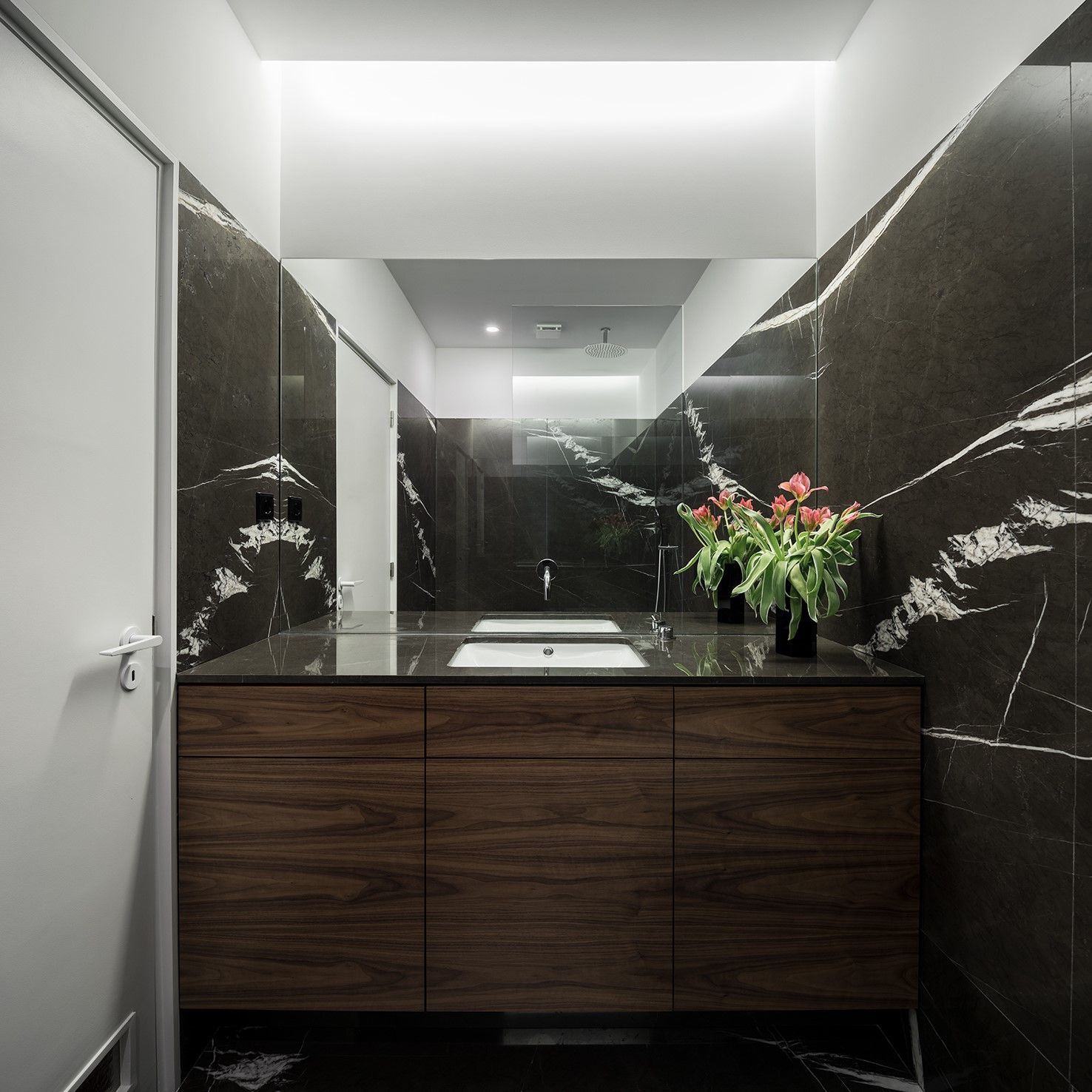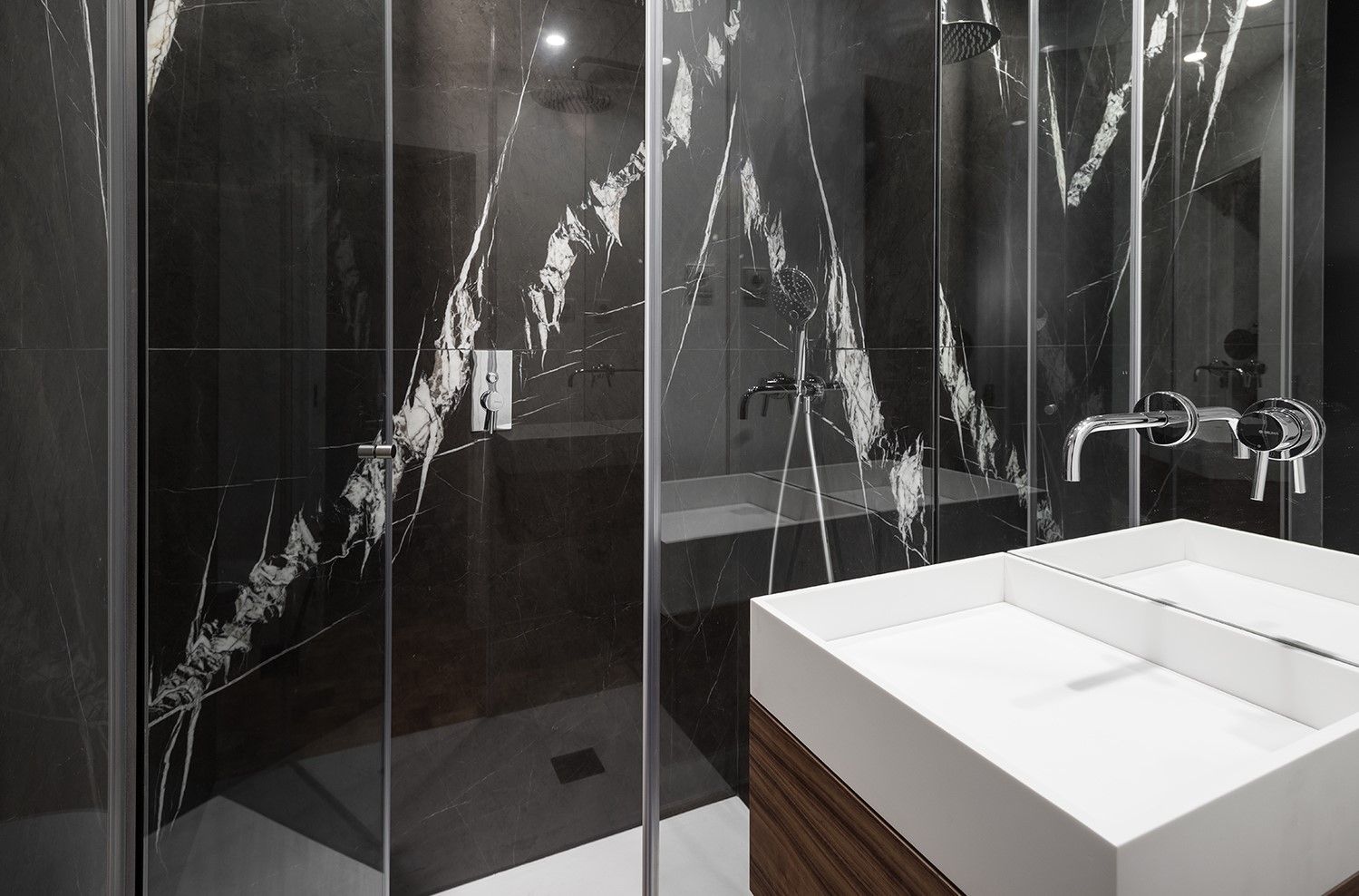 Nos quartos de banho, optou-se por uma renovação total. Ambos foram revestidos com mármore preto e equipados com bases de duche. O antigo sanitário de serviço passou a integrar a zona social como um segundo quarto de banho funcional.