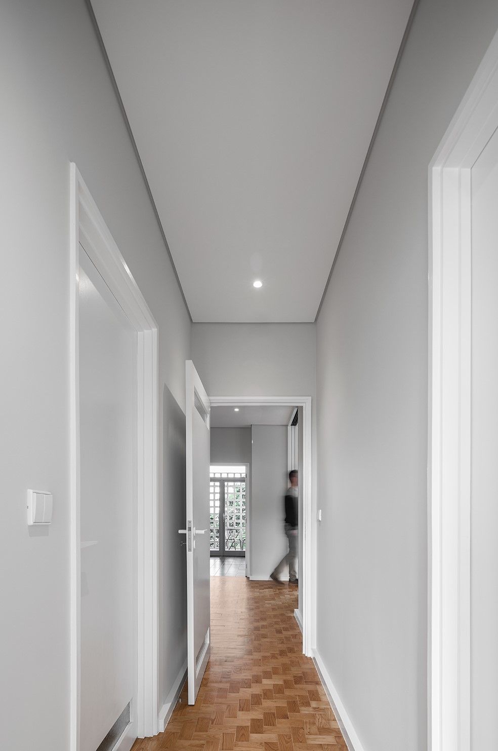 Foram mantidos e recuperados os elementos em madeira considerados essenciais: o pavimento em taco de pinho, as portas com vidros diferenciados consoante a zona da casa, as guarnições e os rodapés altos e expressivos.
