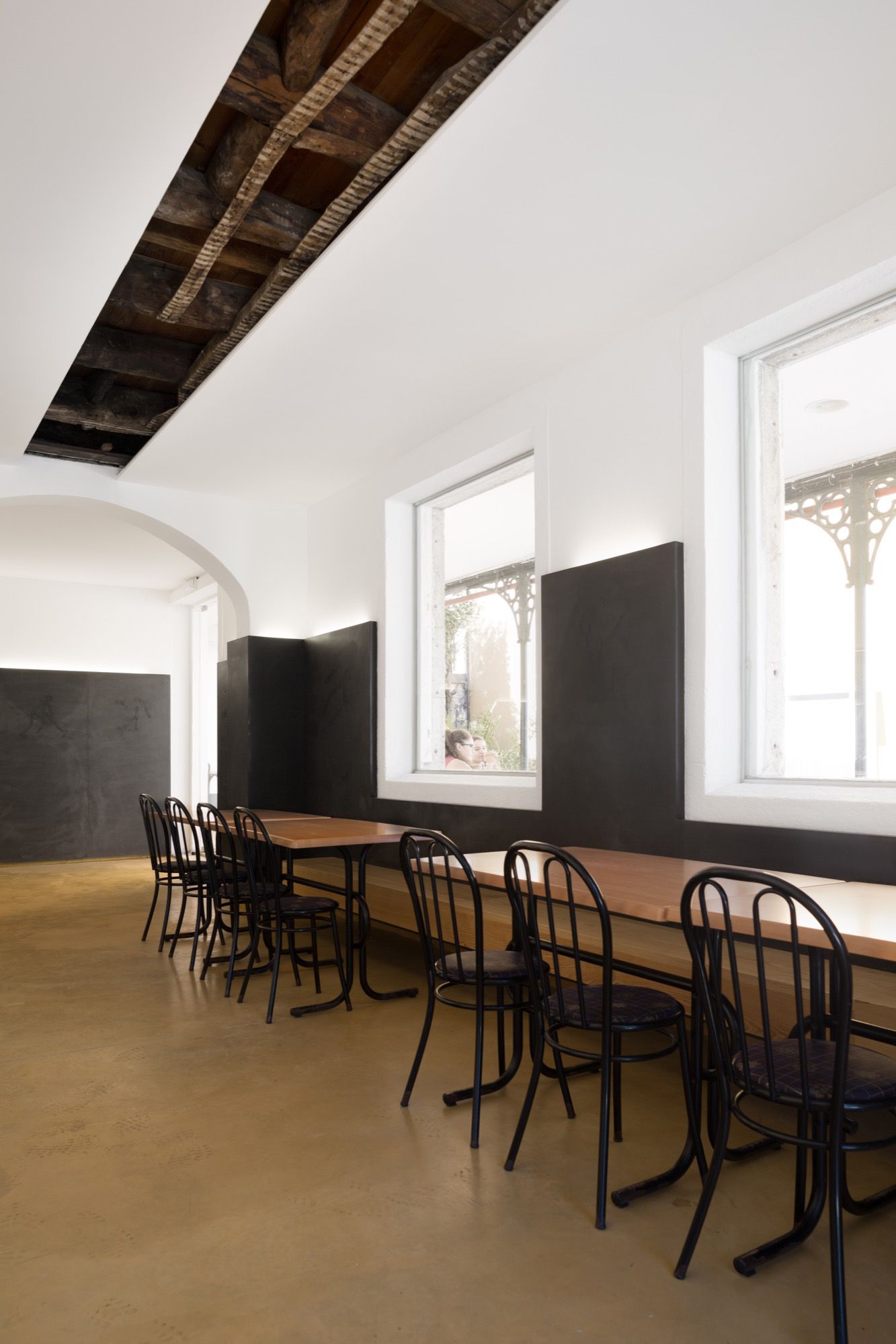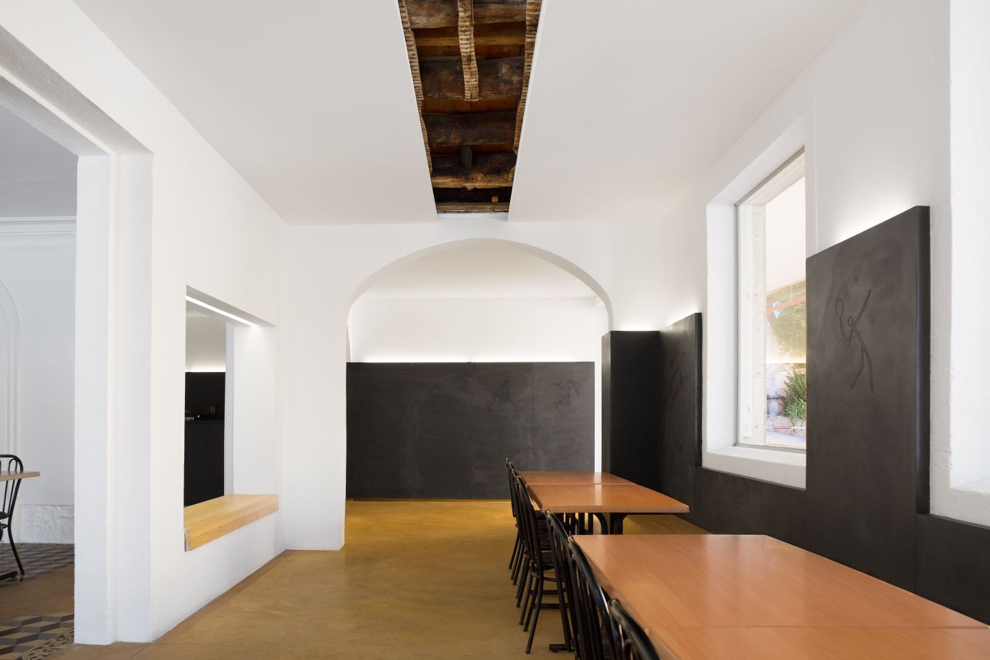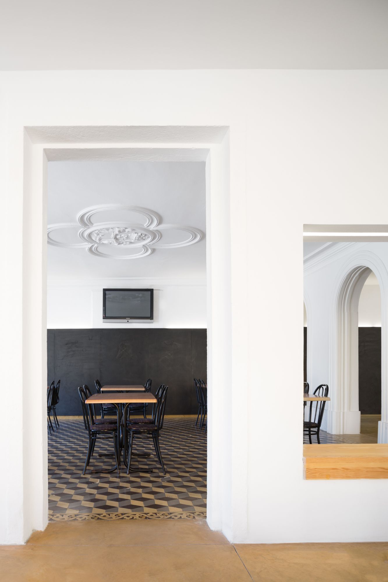 Com recursos financeiros limitados, foi proposta uma solução pouco intrusiva, sem comprometer futuras intervenções, mais estruturantes. Alterou-se a organização do bar, movendo o balcão e a área de serviços para um local mais reservado, mantendo a sala principal e criando uma nova, garantindo uma boa relação com o exterior e a luz natural.