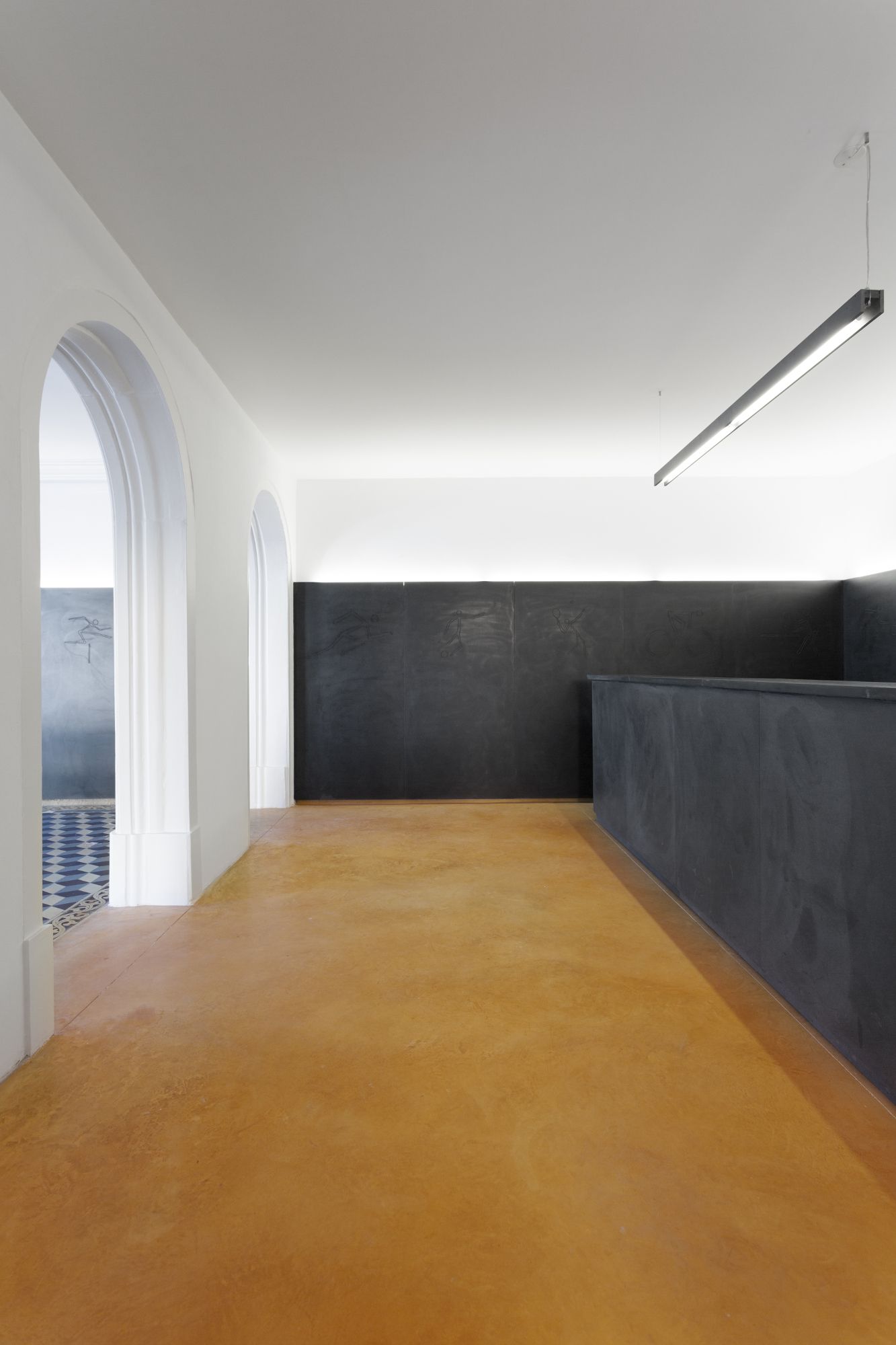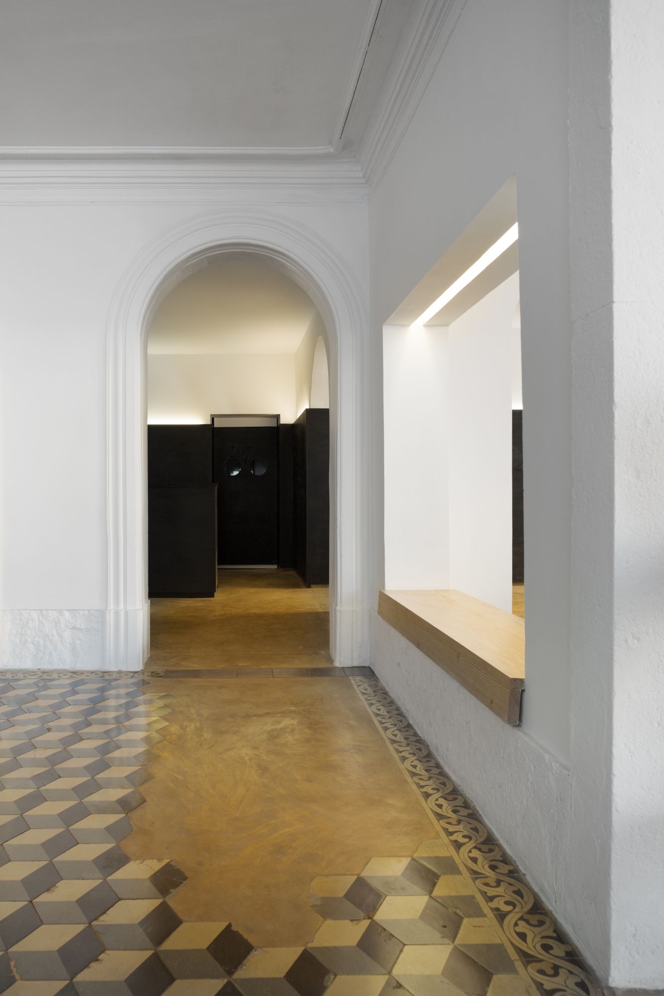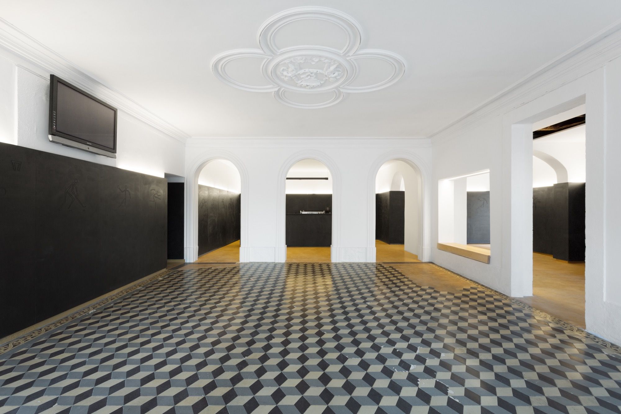 Construtivamente, foram aplicados um novo pavimento e um sistema de painéis nas paredes, cobrindo os vários revestimentos existentes, adiando os necessários trabalhos de uma reabilitação profunda. Durante a obra, descobriu-se um mosaico hidráulico antigo em bom estado, mas com algumas lacunas. A execução de novos mosaicos para colmatar essas falhas revelou-se inviável devido à incompatibilidade dos moldes existentes e aos custos elevados da produção de uma quantidade tão reduzida. Foi decidido manter o pavimento original e preencher essas lacunas com argamassa cimentícia amarela.