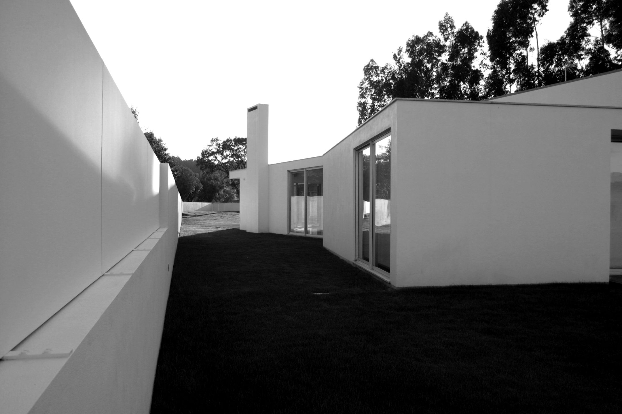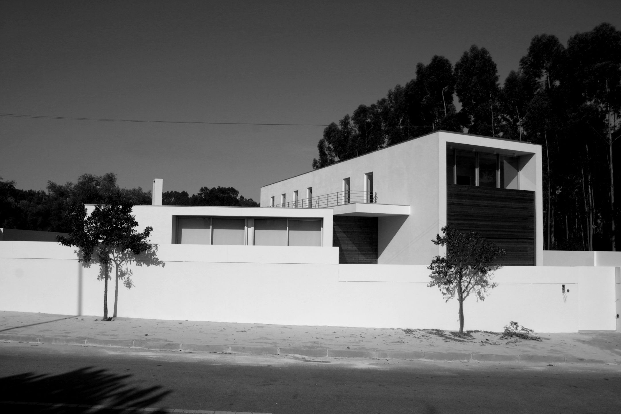 Projeto de uma habitação unifamiliar implantada num terreno triangular, com topografia sensivelmente plana e uma cota ligeiramente superior à da via pública. O lote confronta com um arruamento principal a poente, um caminho a sul e uma área não edificada a norte, não apresentando elementos de vegetação relevantes.