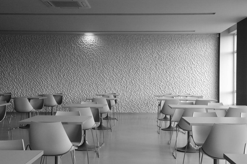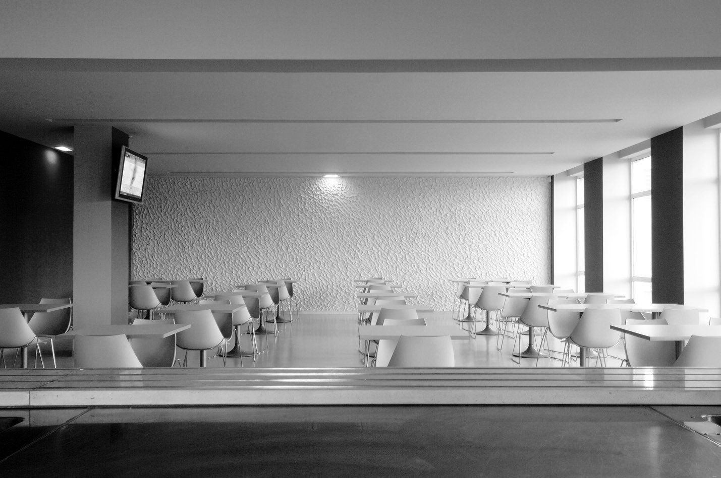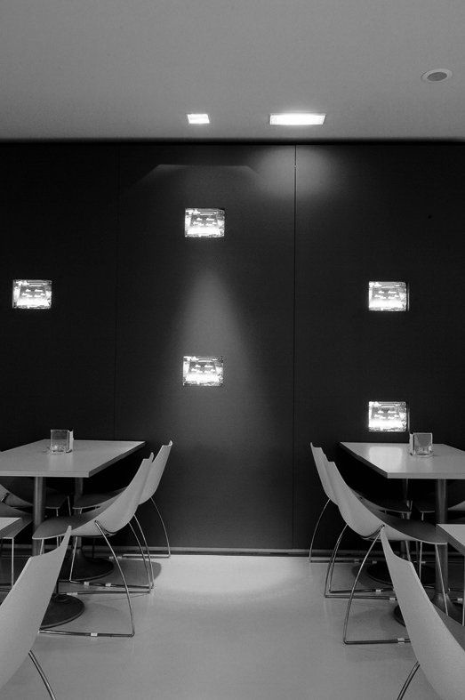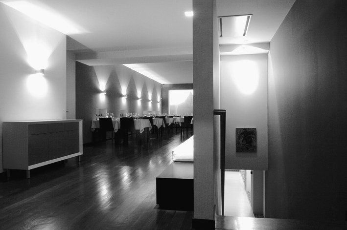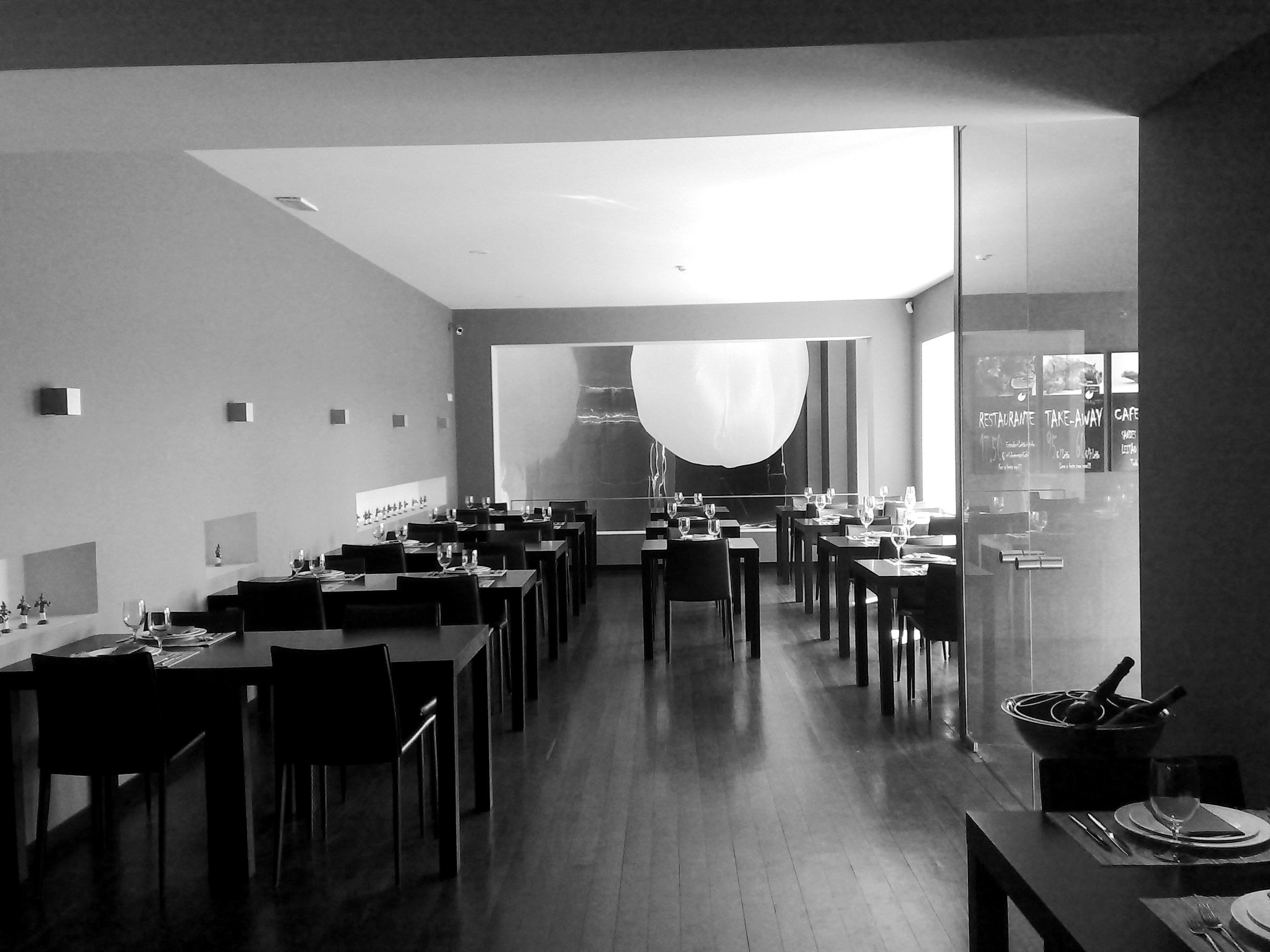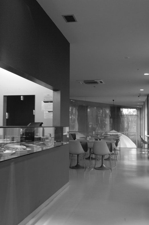 Projeto para restaurante e cafetaria localizados num edifício de escritórios e serviços, na zona industrial da Maia A proposta apresentada divide os usos preten didos pelos três níveis de pavimento existentes (dois deles com entrada pela rua principal, a cotas diferentes e um terceiro com entrada pelas traseiras do edifício, a uma cota mais baixa).