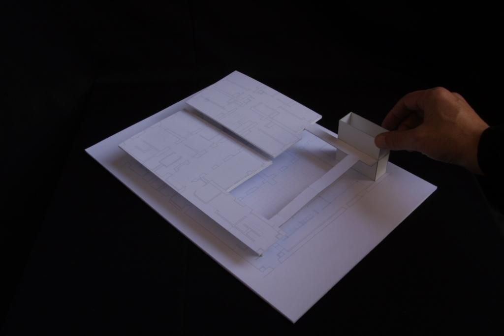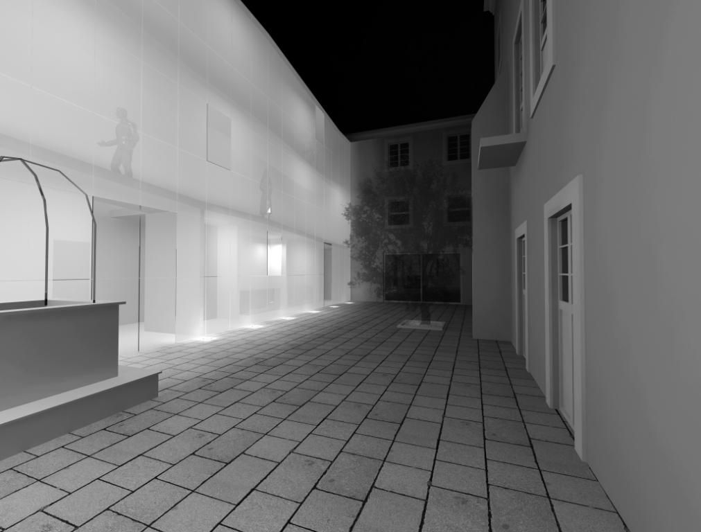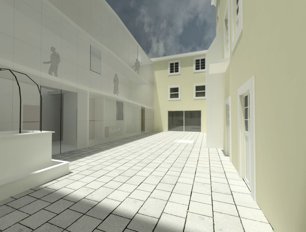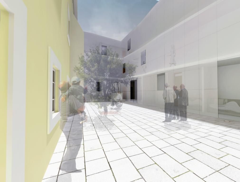 Desse núcleo surgirão as rampas que permitirão percursos acessíveis a todos os pisos do imóvel, qualificando os espaços exteriores existentes e relacionando-se com as preexistências; no presente caso, o pátio existente manterá a sua escala e unidade, dado que o sistema de rampas/escadas/ascensor se implantará nos limites do terreno, substituindo parte das construções anexas.