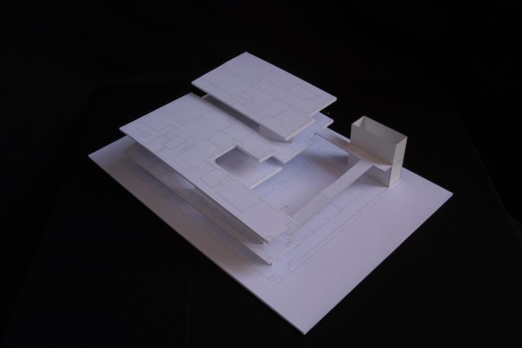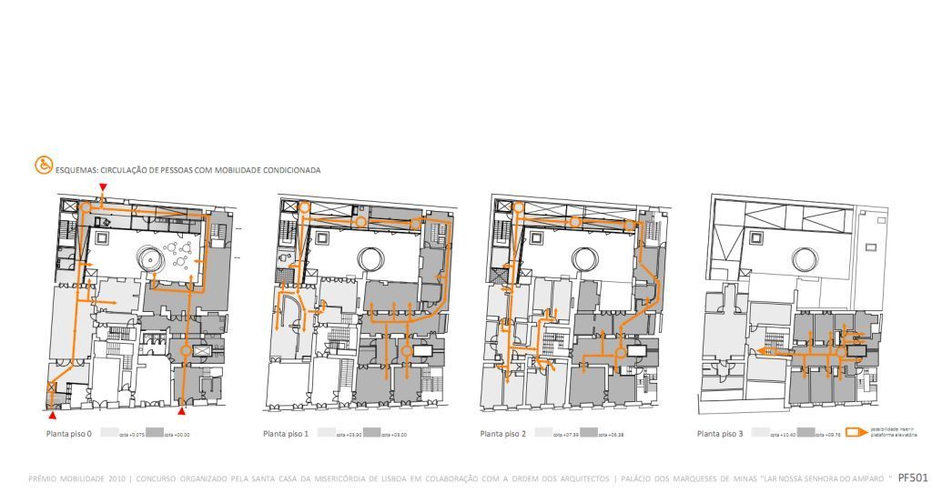 Em síntese: em alternativa a uma solução formal fechada, pretende-se a definição de um sistema composto por um núcleo de caixa de escadas e ascensor, complementado com rampas que permitam as acessibilidades necessárias, num conjunto enquadrado pelas preexistências.