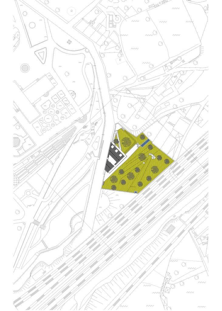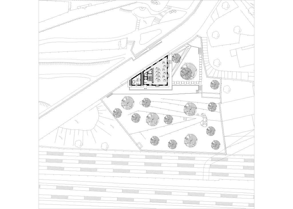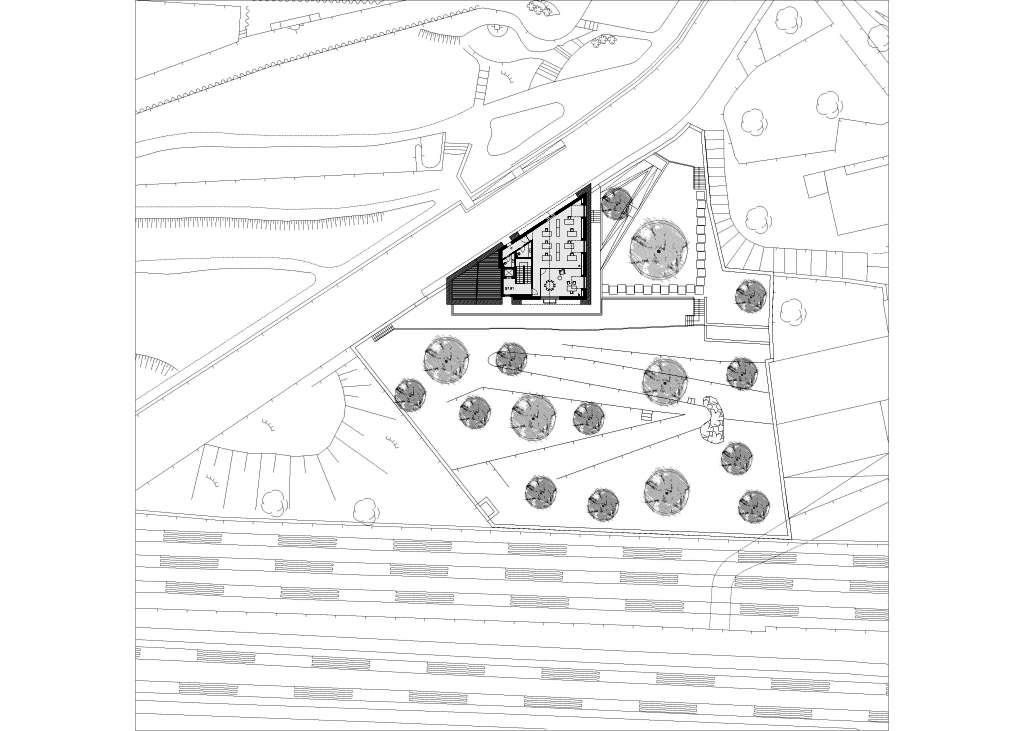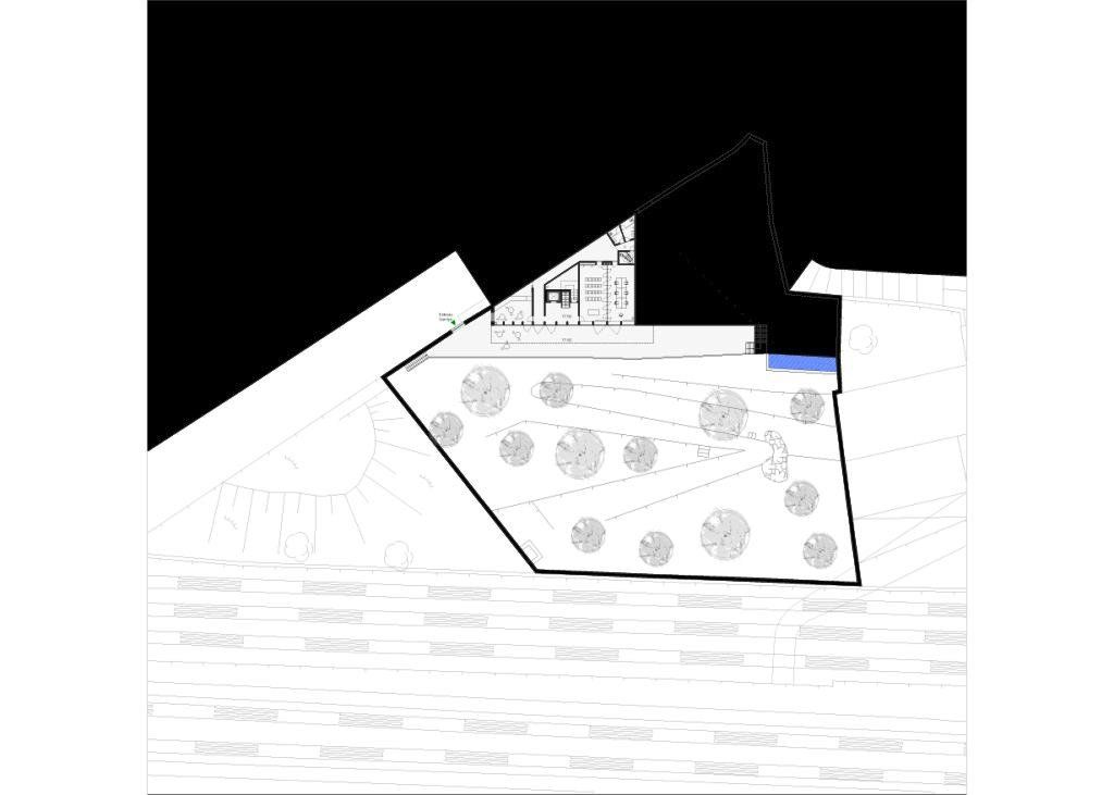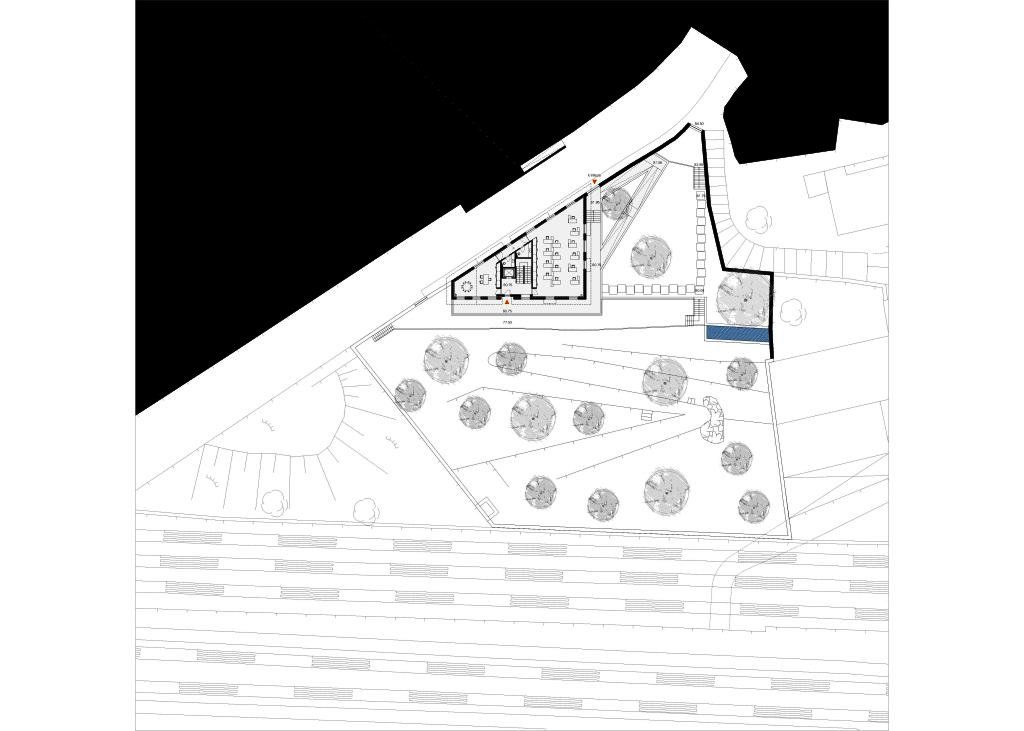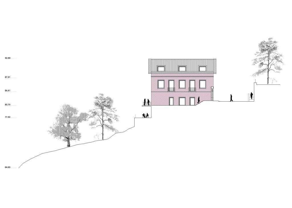 The main access to the building will be from one of the two entrances on the patio: the gate at the highest level and the door adjacent to the building at the middle level. From these entrances, there is access to a landscaped platform and, from there, to the entrance located on the south-east façade, via a gallery overhanging the basement platform. This gallery will also shade the terrace and the openings to the multipurpose room and cafeteria.