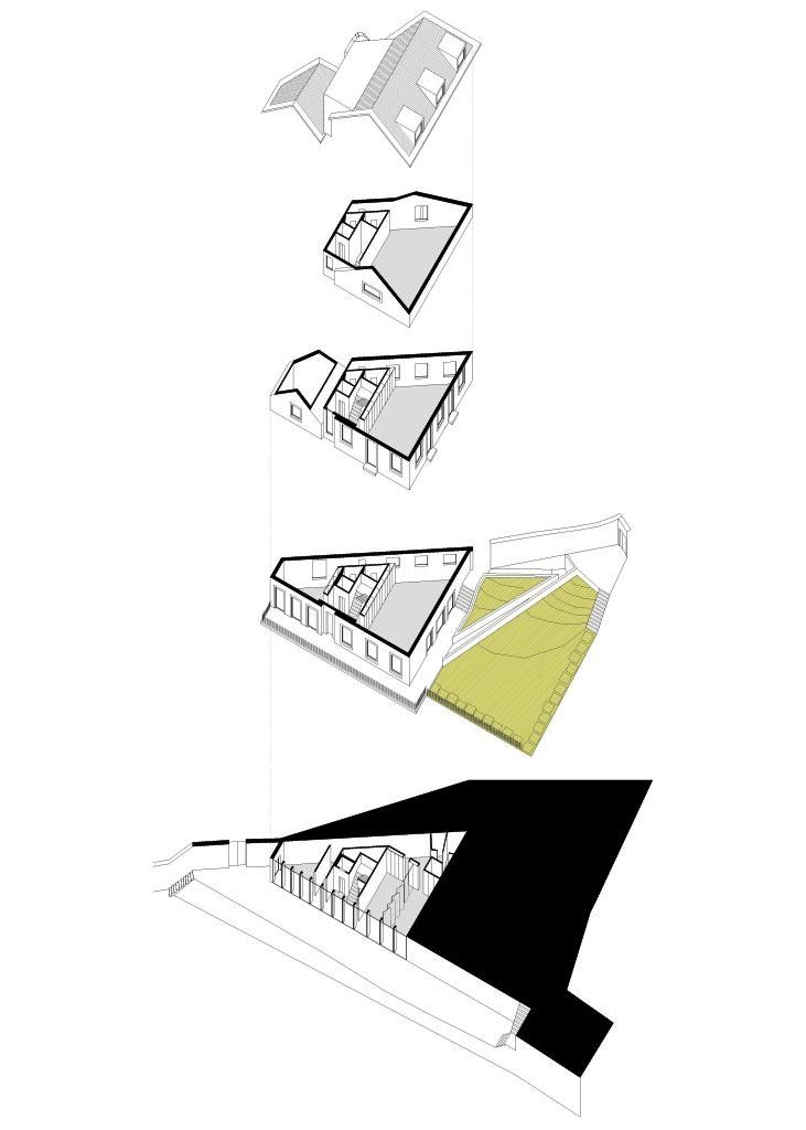 It is proposed to maintain the volume of the existing building and the formal autonomy of each of the bodies defined by the gable roofs. These bodies will be articulated by a new volume of vertical accesses, with a compact and plastically distinct design.