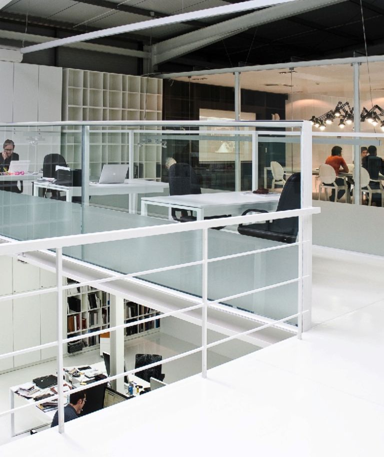 Interior adaptation project of a warehouse for the offices of a graphic communications company. The existing space already contained a set of metal structures that created platforms on an upper floor, with access via two staircases. The intervention consisted of adapting the program to the existing space, taking advantage of the aforementioned structures and closing off the necessary spaces, using mainly glass; the program includes the entrance/reception, three meeting rooms, two offices, toilets and an open-plan studio area. Given the specific nature of this company's graphic work, it was essential to ensure a very well-lit environment, using lamps with a specific light temperature (5500º K) for effective color reproduction; in this sense, the entire space was painted white – metal structures, walls, floors and ceilings.