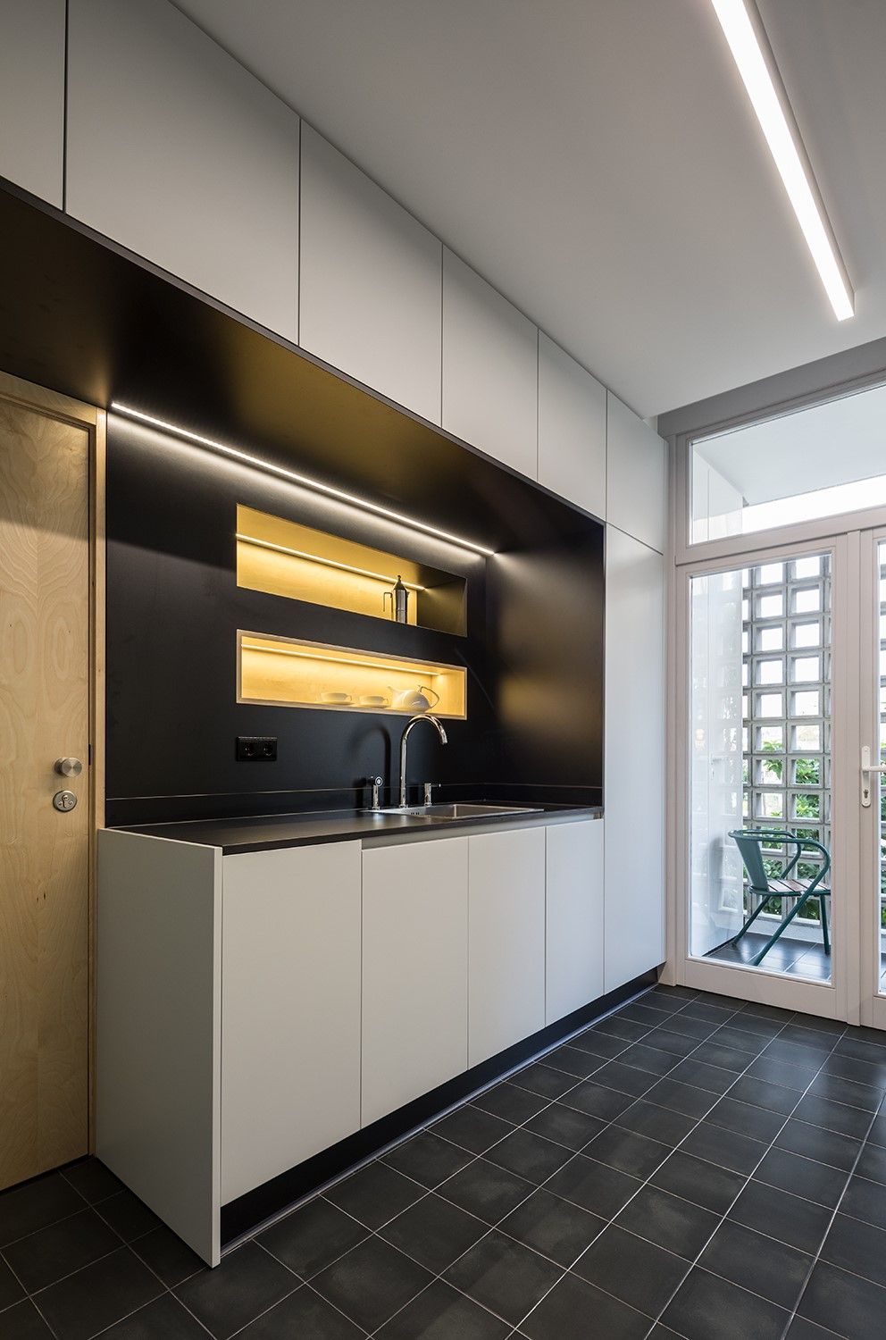 Na cozinha, aplicaram-se s revestimentos com características próximas dos originais: azulejo verde-água nas paredes (11x11 cm) e ladrilho cinza no pavimento (20x20 cm). O armário superior existente foi replicado com adaptações ergonómicas. Foi criada uma bancada com armários e reorganizado o acesso à varanda.