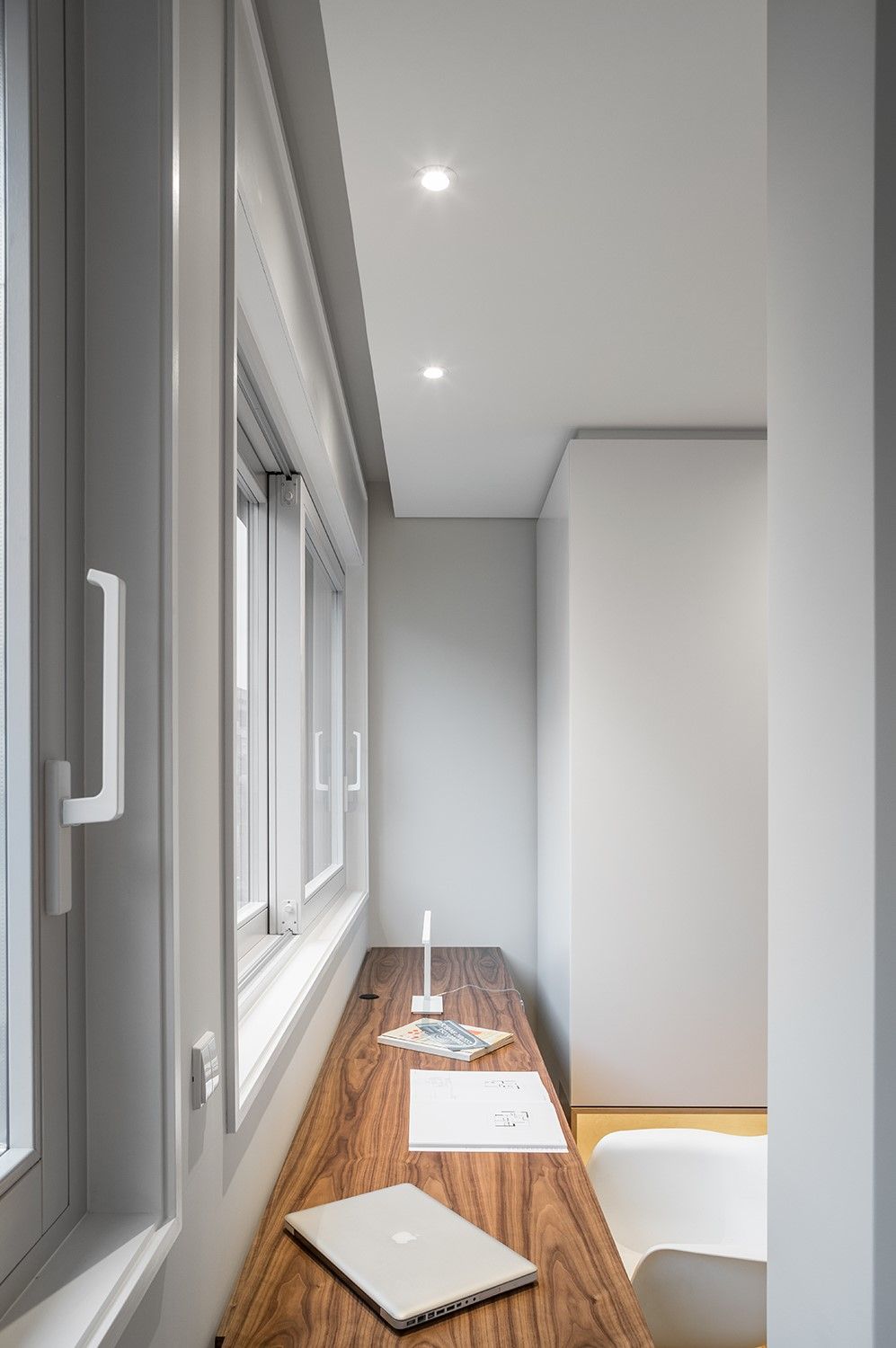 As opções de acabamento das madeiras – pintura das existentes e envernizamento das novas superfícies – tornaram possível uma separação clara dos novos elementos desenhados nesta intervenção: destacam-se uma mesa de trabalho fixa junto à janela da sala e uma porta de correr em vidro translúcido cinza, com aro em madeira de nogueira, que permite diferentes leituras desde a entrada.