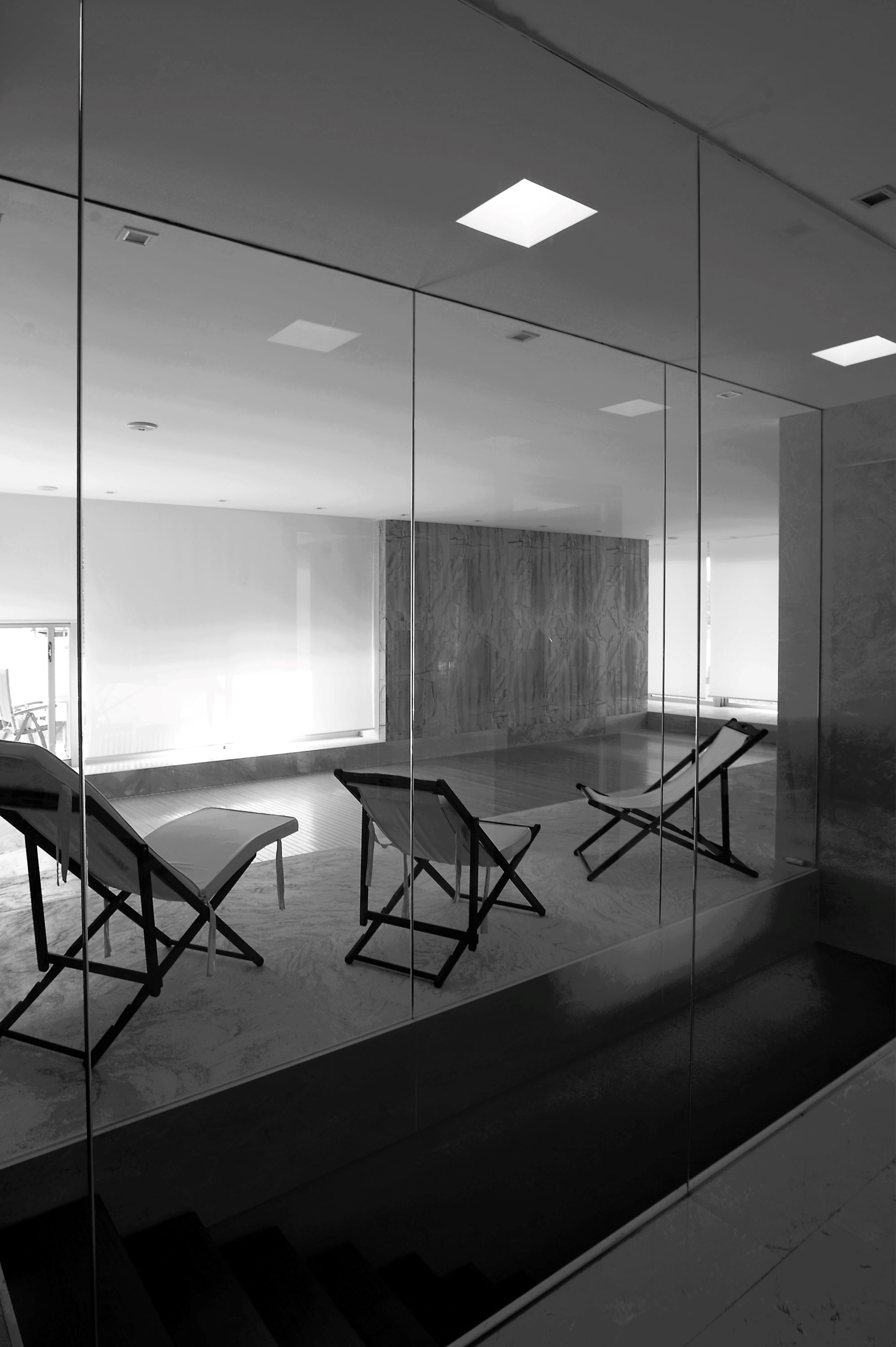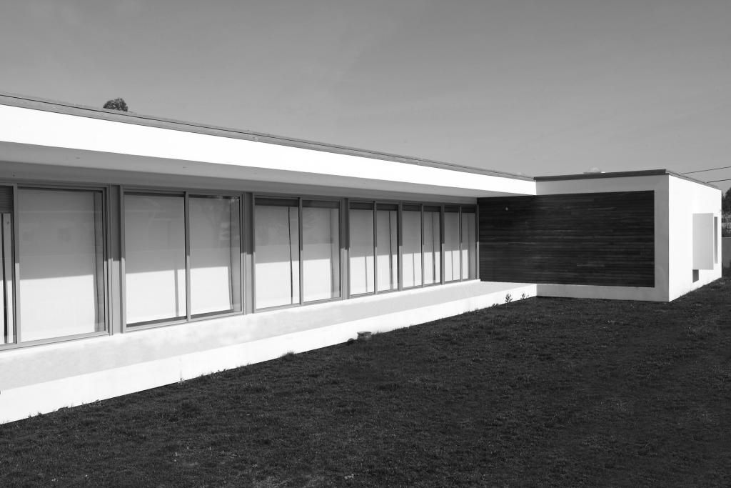 Projeto para uma habitação de grandes dimensões para uso permanente de uma família numerosa, com cinco quartos, três salas, serviços, piscina coberta, sala de jogos e sala de cinema. O terreno onde se localiza esta habitação tem forma retangular, é praticamente de nível e bastante profundo; é ladeado por uma pequena habitação do lado sul e por um pavilhão fabril a norte, numa área urbana, de transição entre habitações e fábricas, ainda rigidamente definida pelos clássicos “zonamentos”. A ideia inicial para este projeto, que chegou a ser desenvolvido em estudo prévio e apresentado ao cliente, consistia num único volume rectangular de um piso, preenchido com “cheios” e ”vazios” em que os “vazios” eram espaços exteriores, por ve zes cobertos nos limites do volume, outras vezes descobertos, criando pátios no interior do próprio volume; era uma solução de intensas relações espaciais que não se tornou viável pela necessidade de adaptar o programa a novas exigências. A evolução do projeto permitiu que se mantivesse sensivelmente o mesmo volume, agora com menos “vazios”, com um piso em cave e com uma pequena extensão do volume inicial, para um quinto quarto, solicitado em plena fase de projeto de execução. A organização espacial interior privilegiou as relações com uma exposição solar eficiente e com a envolvente próxima com quartos expostos a nascente, protegidos na frente do terreno por um muro de cerca de 1,80m, serviços a norte e salas a sul; a piscina coberta e a sala de jogos abrem-se para poente, numa relação franca com o jardim nas traseiras, para onde está previsto um campo de jogos que rematará o conjunto. Sendo a arquitetura uma disciplina integradora, todos os temas contribuem para o enriquecimento dos projetos; esta obra foi, para toda a equipa de projeto, um exemplo de como os desafios, uns estruturais, outros circunstanciais, podem ser reinterpretados.